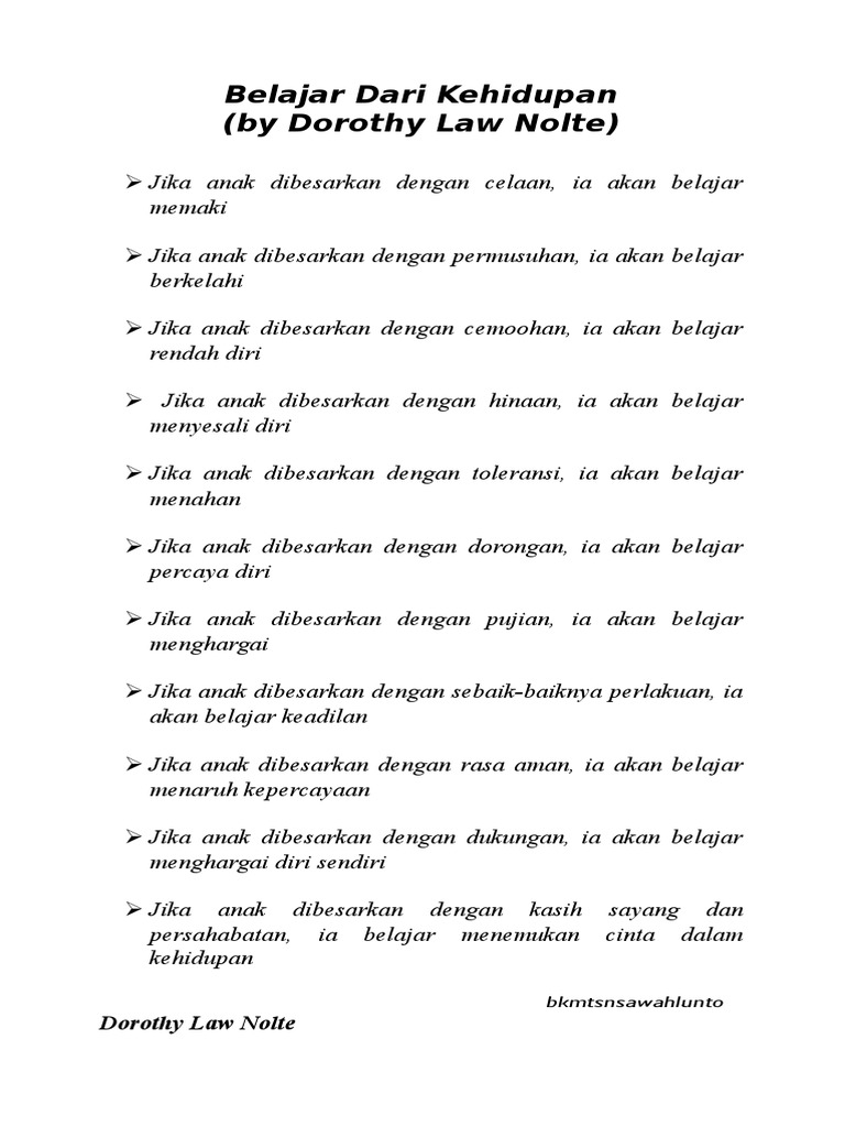 Sebuah tulisan dari dorothy law noltejudulnya children learn what they live jika anak dibesarkan dengan celaania belajar memaki jika anak dibesarkan dengan permusuhania belajar berkelahi jika anak dibesarkan dengan cemoohania belajar rendah diri jika anak dibesarkan dengan penghinaania belajar menyesali diri.