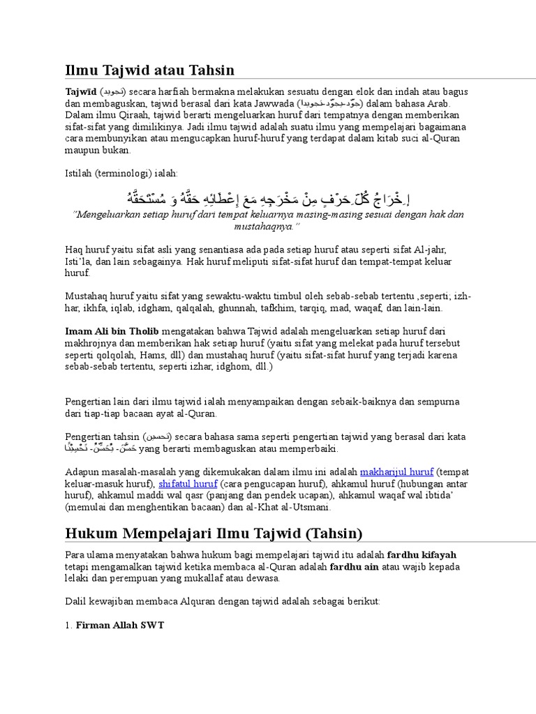 Para ulama menyatakan yang hukum bagi mempelajari hukum tajwid itu adalah fardhu kifayah tetapi mengamalkan ilmu tajwid ketika membaca al quran adalah fardhu ain atau wajib kepada lelaki dan perempuan yang mukallaf. Pengertian ilmu tajwid ilmu tajwid merupakan bagian dari ilmu ulumul quran yang perlu dipelajarimengingat ilmu ini berkaitan dengan bagaimana seseorang dapat membaca al quran dengan baik. Sebagai ilmu tajwid dapat dipelajari sendiri karena mempunyai syarat syarat ilmiahseperti adanya tujuan fungsi dan objek serta sistematik tersendiri.